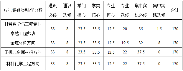 表1 材料科学与工程专业学分数表