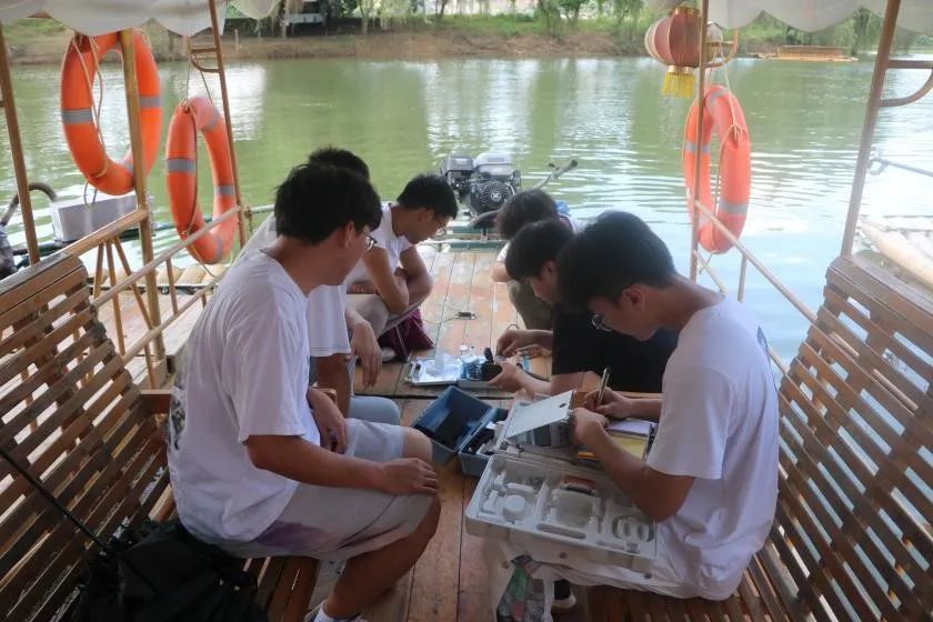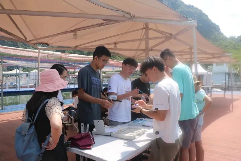 实践团师生们分别去到上林下水源景区、霞客古渡景区和大龙湖景区等三个景区进行水样采集。现场使用快速检测仪测定对采集水样的溶氧量、浊度、PH等多个维度进行水质初步评估。