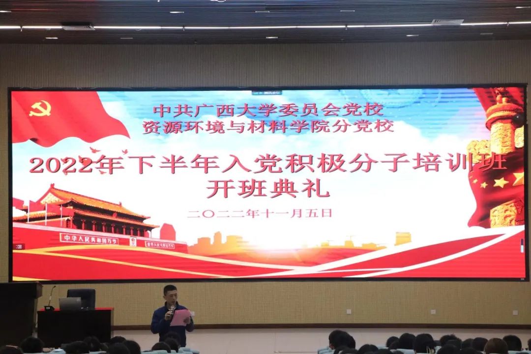 2022年下半年入党积极分子培训班开班典礼在学院报告厅举行。院党委书记沈大强老师、院党委副书记吴达慧老师、培训班班主任覃戟老师出席本次开班典礼,培训班全体学员参加本次开班典礼。