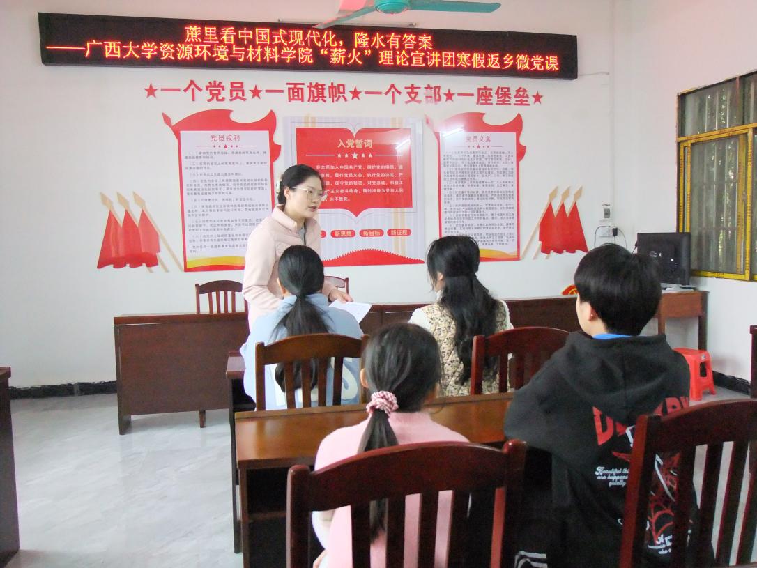 “薪火”理论宣讲团成员张馨丹同学以“蔗里看中国式现代化,隆水有答案”为主题,与村内中小学生代表深入探究家乡糖料蔗产业从“靠蔗吃饭”到“科技赋能”的蜕变之路。她结合隆水村培育特色产业、推动绿色发展的生动实践,生动阐释中国式现代化的基层答卷。现场,张馨丹还详细介绍学校资助政策体系和学院学科特色,鼓励孩童以学业为重,努力为中国式现代化挺膺担当。
