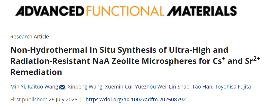 近日,我校金属资源高效利用及环境保护协同创新中心在分子筛合成研究方面取得新进展,相关研究成果以“Non-Hydrothermal In-Situ Synthesis of Ultra-high and Radiation-Resistant NaA Zeolite Microspheres for Cs+ and Sr2+ Remediation”为题,发表在国际顶级学术期刊Advanced Functional Materials上。该论文由明升官网