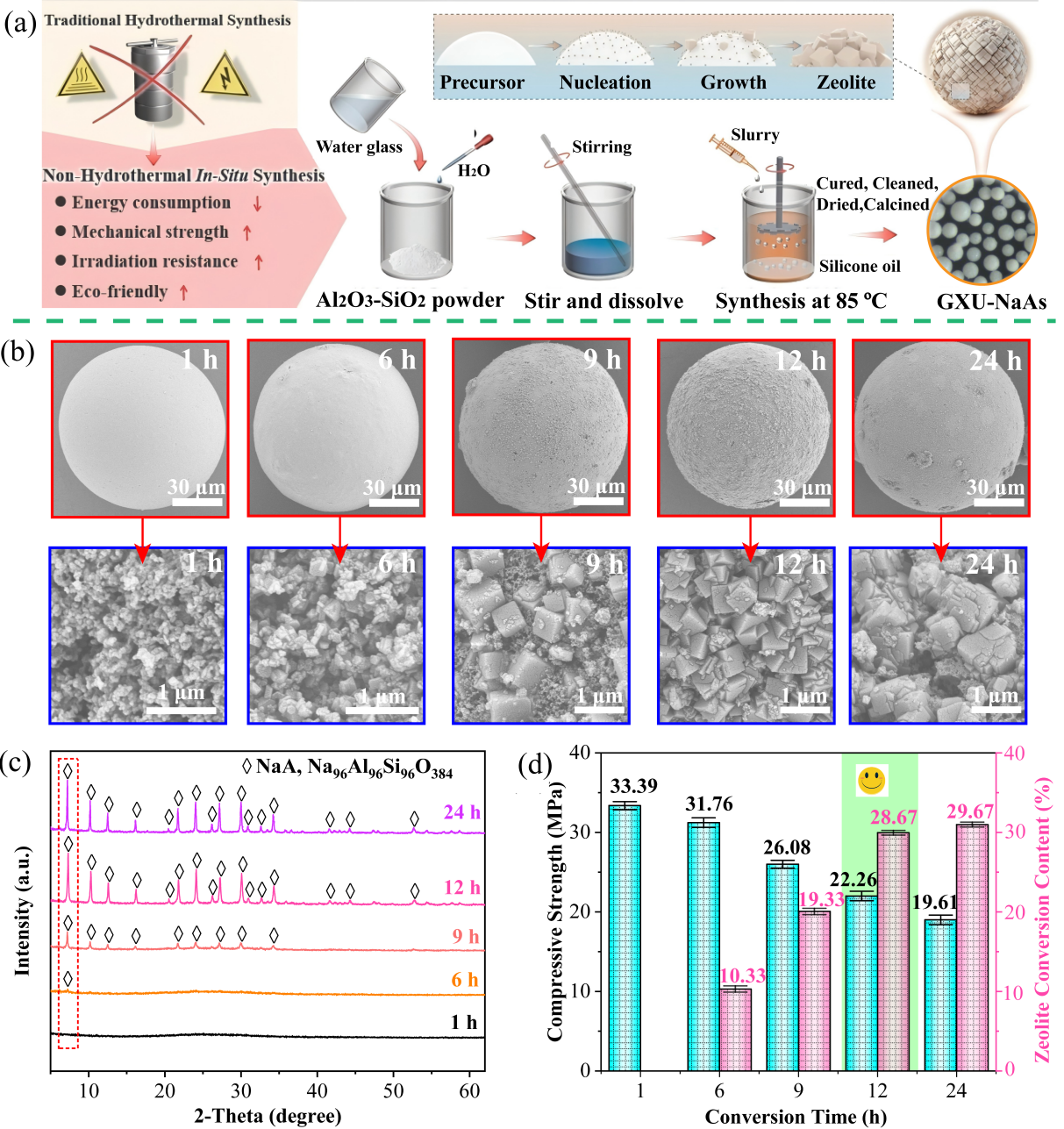 与传统分子筛材料需高温高压、依赖有机模板或二次成型的工艺不同,GXU-NaAs采用非水热原位合成技术,以地质聚合物技术为核心,首次实现无粘结剂制备高强度分子筛微球。该方法制备的GXU-NaAs具有卓越的机械性能:抗压强度达22.26 MPa,远超多数传统钠系分子筛材料;维氏硬度395.48,磨损率仅0.0087 %,可耐受动态吸附中的摩擦与冲击,避免结构破裂或粉碎,彻底解决了传统粉末沸石易堵塞、压降大的问题。同时,GXU-NaAs经500 KGy辐照照射后,仍能保留99 %的抗压强度和99 %的Cs+、Sr2+吸附容量,具有在核环境中保持优异稳定性的潜力。这项工作不仅解决了传统分子筛机械强度低、辐照后性能衰减及粉末材料易堵塞的问题。更为核废水高效净化提供了“高强度+耐辐照+高吸附”三位一体的解决方案。