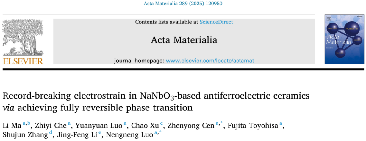 罗能能教授团队在无铅反铁电陶瓷电致应变领域取得重要进展,相关研究成果以“Record-breaking electrostrain in NaNbO3-based antiferroelectric ceramics via achieving fully reversible phase transition”为题,发表在材料领域期刊Acta Materialia上。明升88