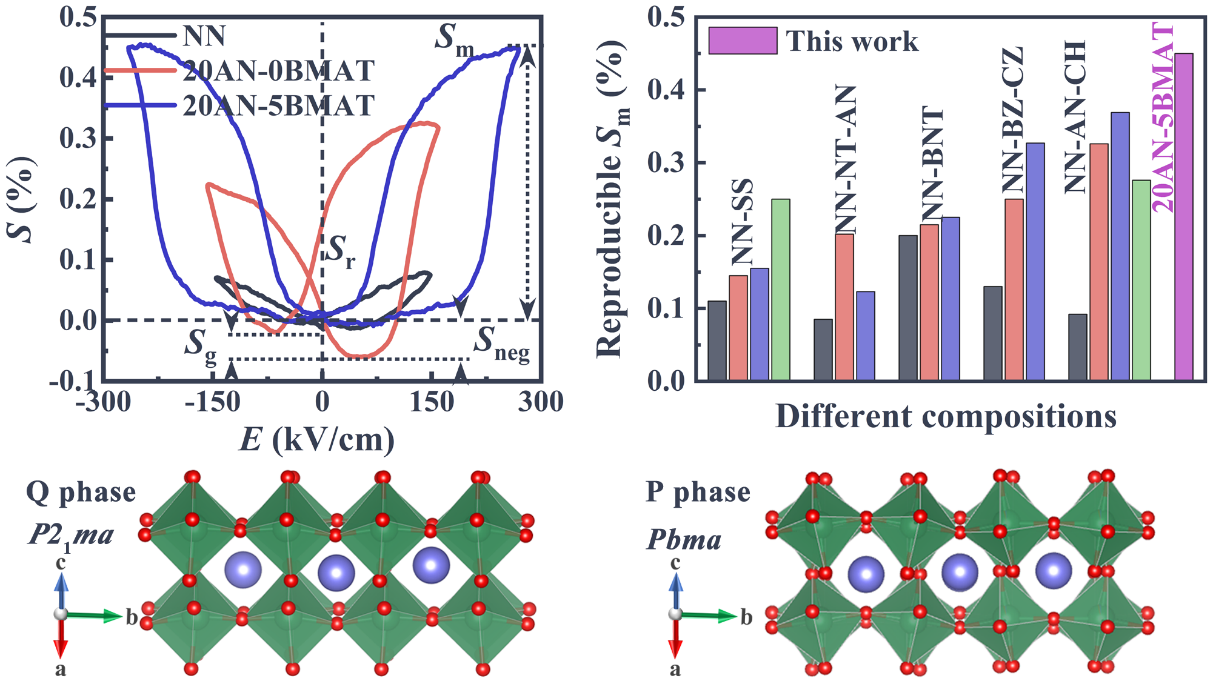 作为一种典型的无铅反铁电体,NaNbO3虽具有反铁电体的结构特点,但在电场作用下只能获得蝴蝶形的应变曲线且应变数值小(~0.08%),而这与反铁电P相稳定性不足有关。为提高P相的稳定性,调控容忍因子是常用策略,然而依旧无法获得高的应变。针对上述问题,本研究提出单独降低电负性差值稳定P相和获得可逆相变的思路。通过引入低电负性差值的AgNbO3和Bi(Mg1/3Al1/3Ti1/3)O3,创纪录的应变数值(0.45%)在0.75NaNbO3-0.2AgNbO3-0.05Bi(Mg1/3Al1/3Ti1/3)O3反铁电陶瓷中获得,该陶瓷的P相稳定性及相变可逆性通过电学性能、原位变电场拉曼光谱等进行研究。此外,经过结构拟合发现,P相稳定性提升的关键在于八面体倾转角和A/B位阳离子位移的减小。