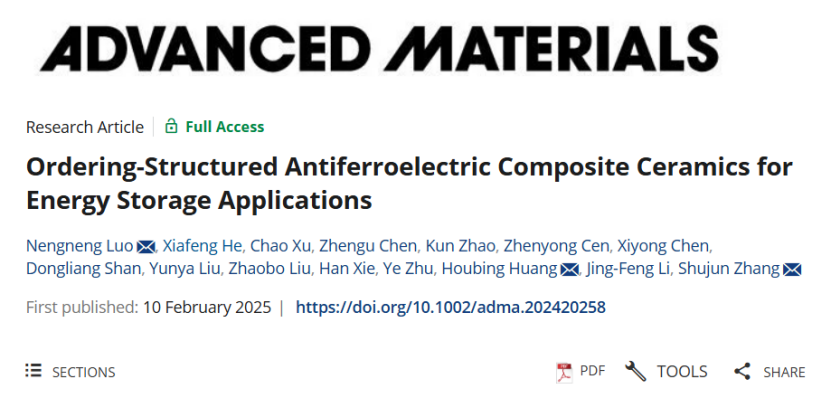 罗能能教授团队在氧化铝增强复合电介质储能陶瓷研究领域取得重要进展,相关研究成果以“Ordering-Structured Antiferroelectric Composite Ceramics for Energy Storage Applications”为题,发表在材料领域顶级期刊Advanced Materials上。明升88