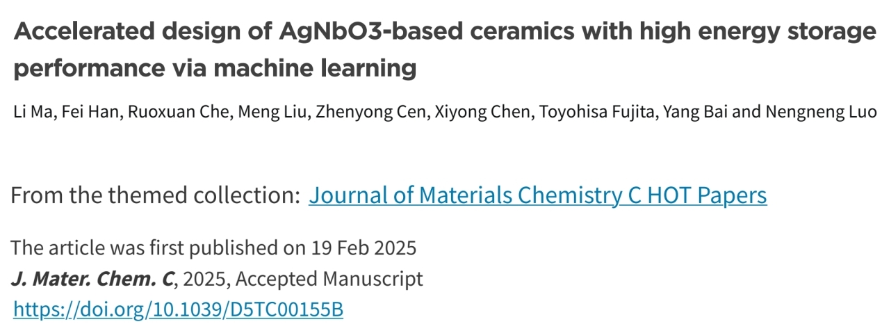 罗能能教授课题组在利用机器学习指导无铅反铁电储能陶瓷设计领域取得重要进展,相关研究成果以“Accelerated design of AgNbO3-based ceramics with high energy storage performance via machine learning”为题,发表在材料领域期刊Journal of Materials Chemistry C上,并被评选为热点文章。化学化工学院博士生马力和北京科技大学博士生韩飞为该论文的共同第一作者,明升88