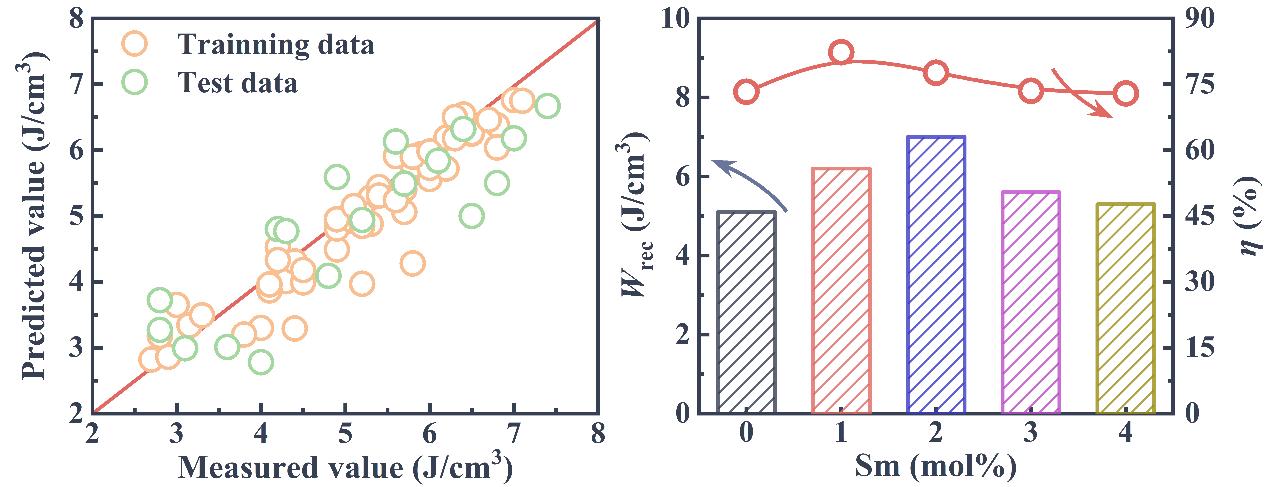 课题组以铌酸银基反铁电材料为典型代表进行机器人学习预测。首先,通过总结并筛选已报道的铌酸银基反铁电材料,以储能密度为目标获得初始的数据集,其中包含124个样本。然后,选定与反铁电材料的储能密度密切相关的三个参数(EN-MB、Vec/Z和 Rdce)作为描述符来评价储能密度。进一步将数据集划分为75%的训练集和25%的测试集,同时基于7种不同的迭代模型对训练集和测试集进行迭代,选出最优的迭代模型为支持向量回归的径向基函数(SVR.rbf)。最后,用选定的迭代模型对(Ag1−x−3y-4z-3m-3n-3tNaxLayCezNdmSmnTbt)(Nb1-sTas)O3成分的储能密度进行预测,最终从491520种可能的化合物中筛选出储能密度前十的数据进行排列,发现它们的基本成分为(Ag0.94Re0.02)(Nb0.6Ta0.4)O3。基于电负性和离子半径等因素,选定Re为Sm并做实验研究,实验结果为7.0 J/cm3,与机器学习预测值6.76±0.55 J/cm3基本一致。本研究将加速电介质材料储能性能的预测和开发。