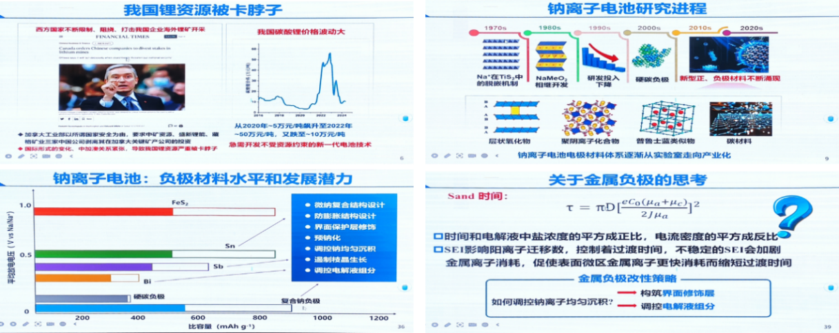 报告会上,余彦教授以其深厚的学术功底和前瞻性的视野,系统深入地梳理了钠离子电池技术的演进历程。她从材料体系的革新维度切入,生动详细地阐述了层状氧化物/聚阴离子型正极材料、硬碳负极材料的前沿突破,以及适配性电解质体系的设计优化策略。随后,余教授从工程化的独特视角出发,深入剖析了全电池能量密度提升的关键路径与长循环寿命的保障机制,为钠离子电池的产业化进程提供了宝贵的理论支撑和实践指导。针对产业化过程中面临的诸多挑战,如电极材料的空气稳定性、界面副反应的控制以及规模化制备工艺的优化等,提出了切实可行的解决方案,为师生们指明了研究方向。最后,基于对我国钠离子电池产业链的深入调研和分析,她详细介绍了产业链的布局情况和发展现状,并对未来钠离子电池在技术创新和商业化应用方面的发展趋势进行了展望。