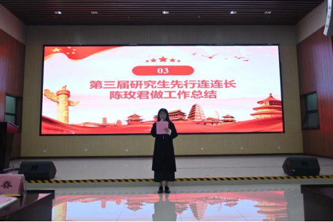 研究生先行连在学院123报告厅举行2023年秋季学期期末总结大会。学院团委书记陈宏、团委副书记兼研究生先行连指导老师田春出席会议,研究生先行连全体成员、党建会及研究生党支部代表参加会议。