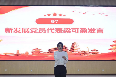 在发言环节,新发展党员梁可盈同学号召全体连员认真学习党的理论知识并积极投身实践活动,做到政治上有明显进步、思想上有更高觉悟、发展上有明显成效,永远坚定为共产主义奋斗终身的伟大理想。