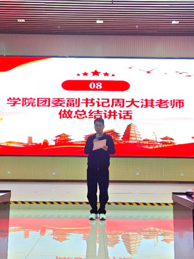 大会最后,周大淇老师作总结讲话。他向全体连员提出期望:要努力成为理论学习的“先行者”、实践奉献的“排头兵”、新风正气的“火炬手”,持续传递青春正能量,在时代的赛道上奋力跑出最好成绩。